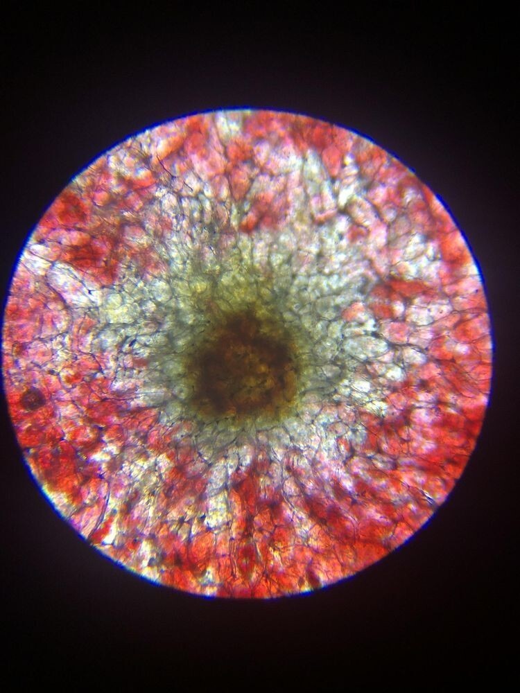 Enlarged tips of moss leaves stained with a dilute solution of iodine