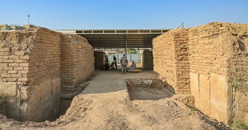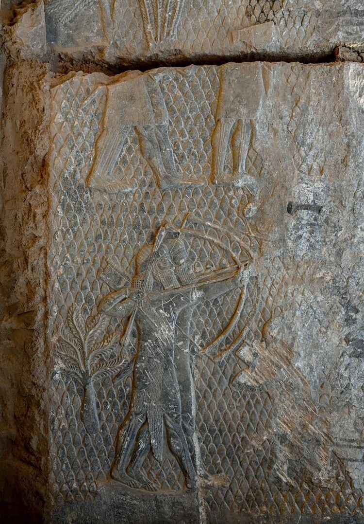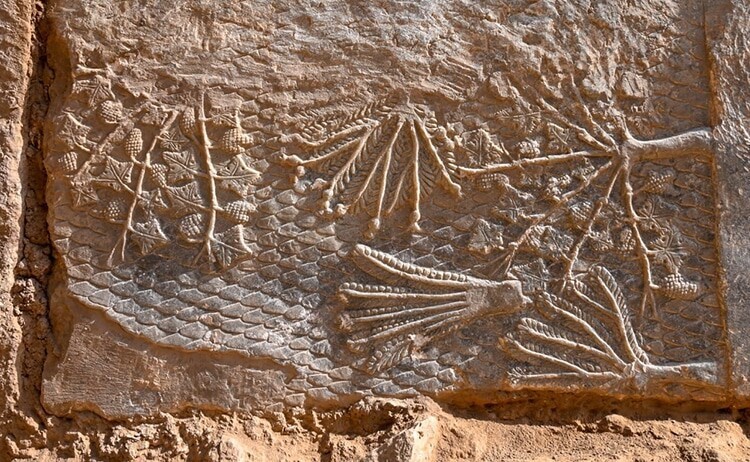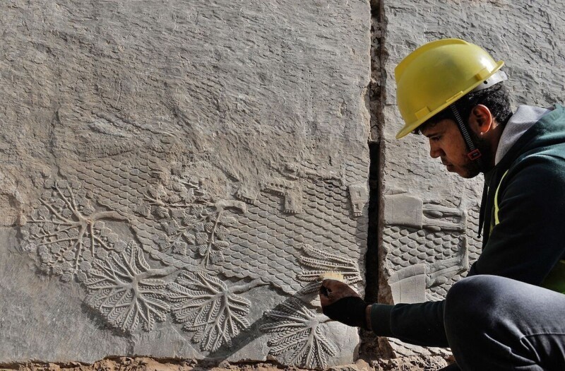 Restoration projects started after the area was recaptured the Iraqi government. American and Iraqi archaeologists joint effort discovered eight marble slabs that adorned the ancient gates and preserved with little damage. The slabs date back to the reign King Sennacherib from 705 to 681 BC. They probably decorated imperial palace within the city walls before they were moved for gate decorations during the heyday of the next ruler. When strengthening bas-reliefs on the gates, they were partially buried, thanks to which they the underground parts survive, while the exposed carvings weathered. The surviving bas-reliefs depict classical motifs Assyrian art: archers, vines and palm trees.