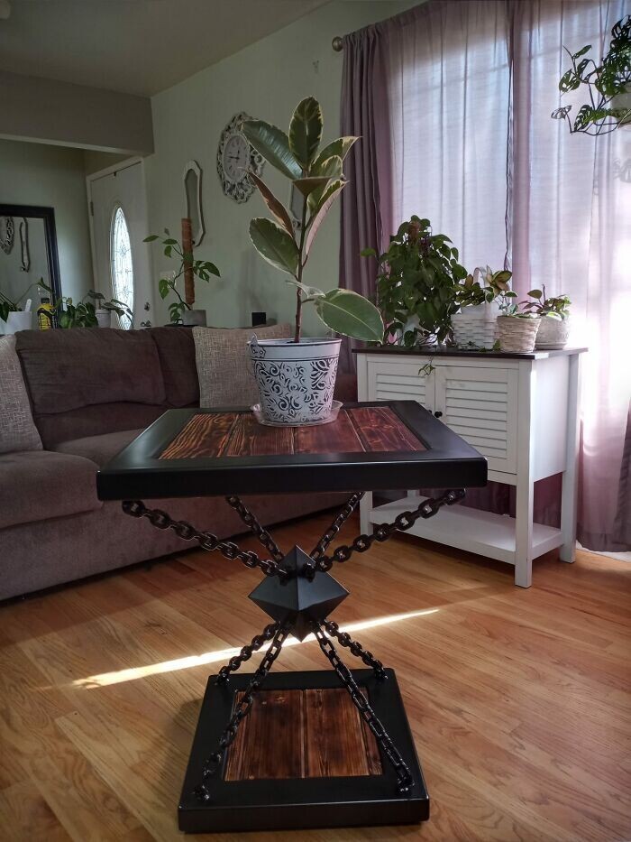 9. "My husband is a welder. He made this table from scrap metal, chains and wood."