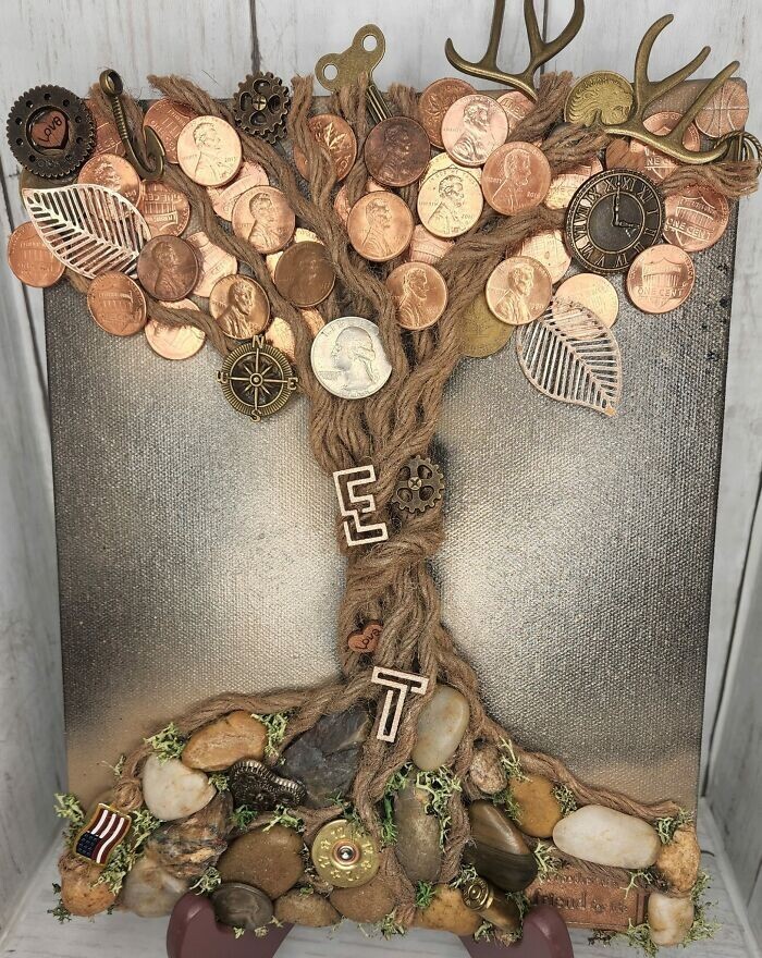 There are coins with the year of his birth, the year he married my grandmother, and over the years when his children, grandchildren and great-grandchildren were born. A plus various items representing his hobbies and what he loves study.