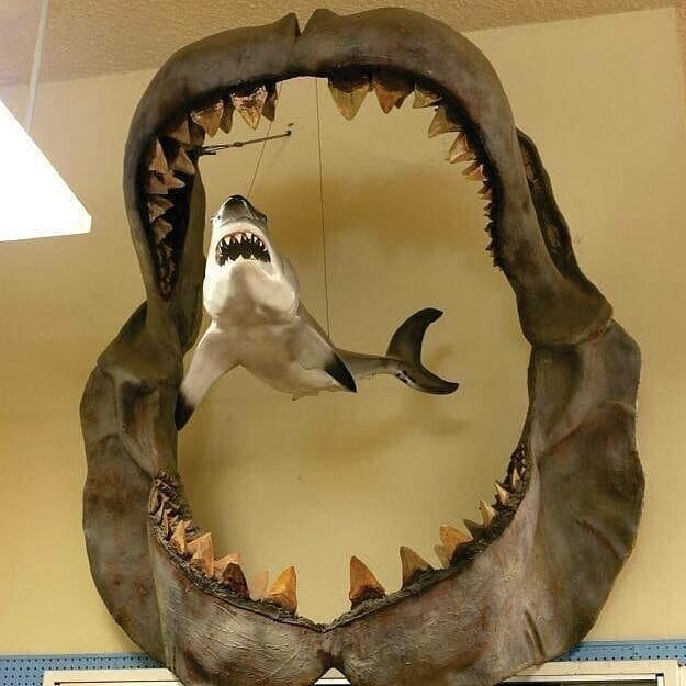 The jaw of an ancient megalodon compared to a 3m great white shark