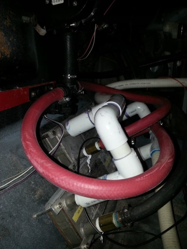 Engineers had to work hard when it came to installation pump, filter and overflow tank. They had to run pipes through inside to the right places in the hot tub itself. For heating water up to 102 degrees they decided to use a car engine - it will be take place using the heat exchangers in the image below, which installed on the floor under the passenger seat.