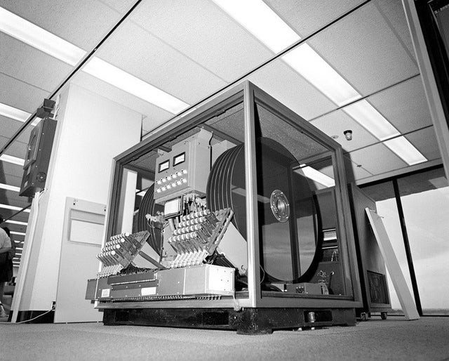 Photograph of an engineer making a connection to one of the first IBM computers, 1958