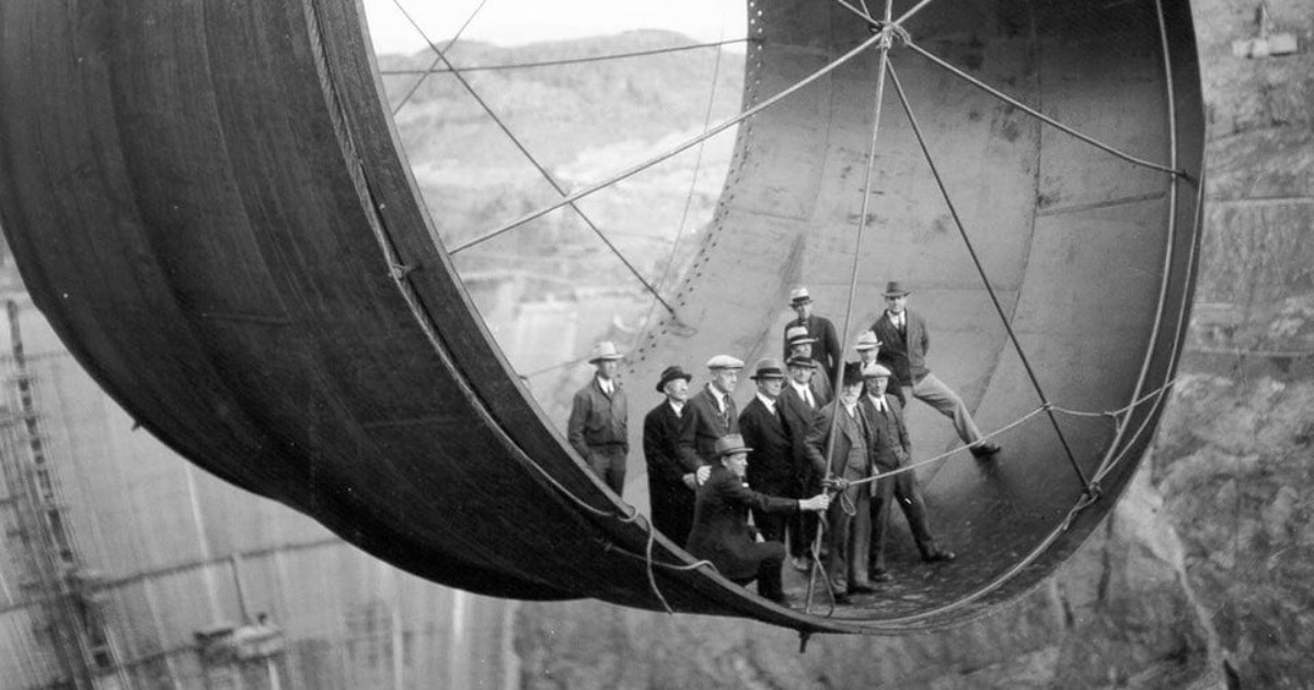 Men stand on a section of steel pipe for the Hoover Dam nearing completion, 1935.