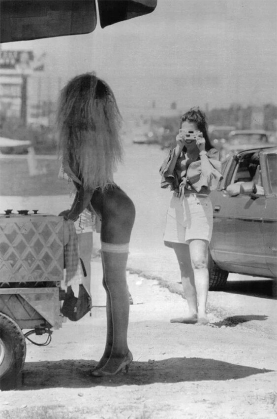 A girl in a thong advertises a hot dog shop. Florida, 1990s