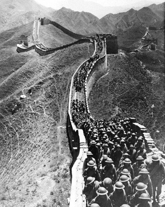 Chinese infantry marching along the Great Wall near Beijing. Second Sino-Japanese War. October 1938
