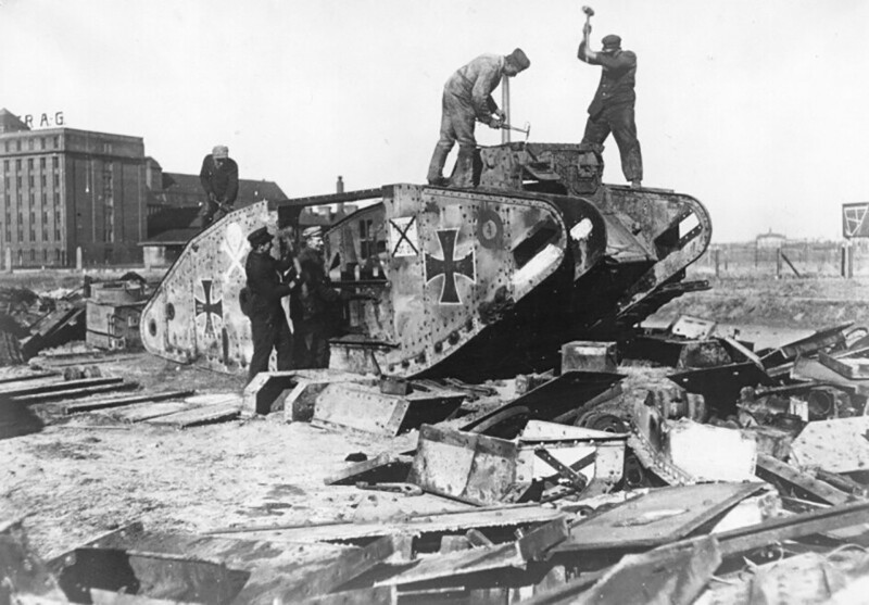 Workers are dismantling a captured English tank. Berlin. Weimar Republic. 1919