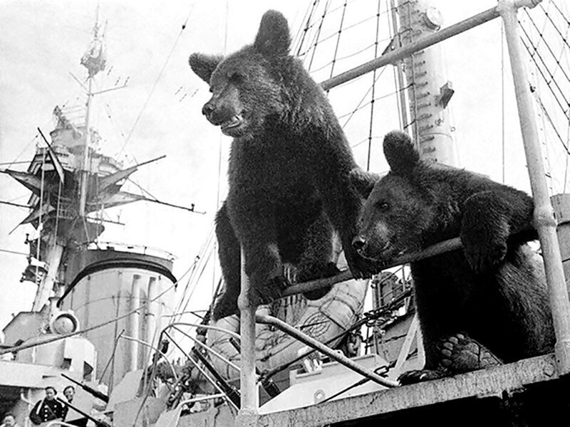 Bear cubs Mishka and Mashka are pets of the naval crew on the Soviet battleship Arkhangelsk. Kola Bay, Vaenga. 1944 USSR