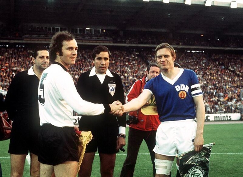 Team captains: West Germany (Franz Beckenbauer) and East Germany (Bernd Branch) - before the match during the World Cup. Hamburg, 22 June 1974