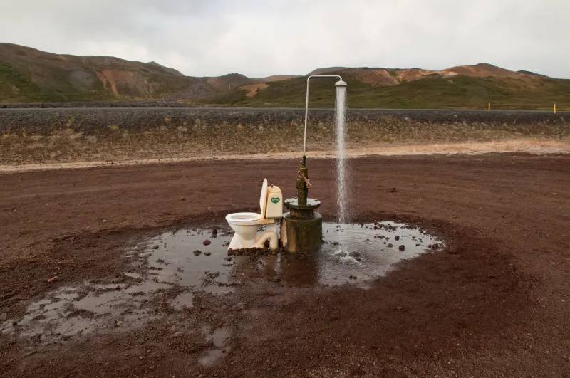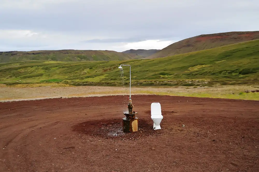 Perhaps the most mysterious and at the same time open bathroom in the world located slightly away from the road leading to the geothermal station Krafla, near the caldera of the same name. In the middle of a big patch of dirt there is a toilet with a shower. The shower is working and, moreover, hot, as powered by a thermal spring. The water is clean. The toilet is very popular with tourists. Like an art object.