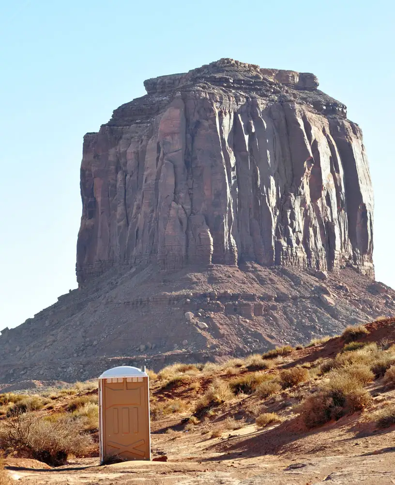 “We strive to provide our customers with exactly what they need. deserve,” says the website of the American supplier of portable toilet cubicles, operating throughout the country, in particular in the Valley monuments. Among the cinematic rocks-outliers, typical booths beige colors look quite organic.
