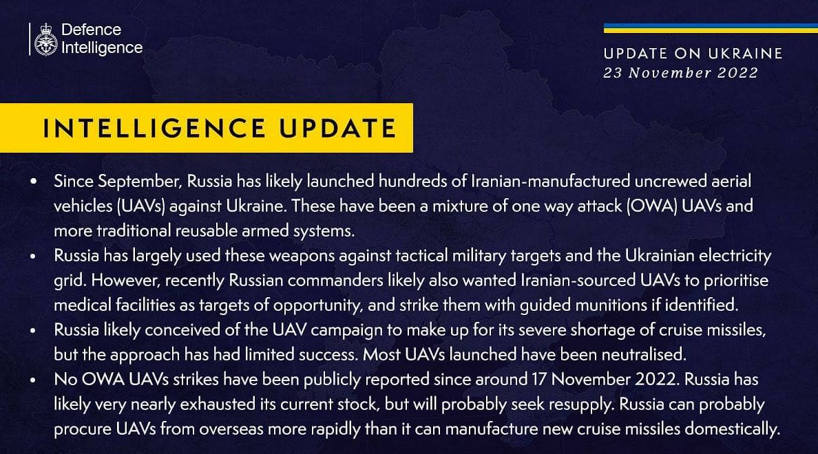 - Russia probably used up almost all the Iranian-made drones they had, according to British intelligence. The department notes that there has been no information about drone strikes since about November 17.