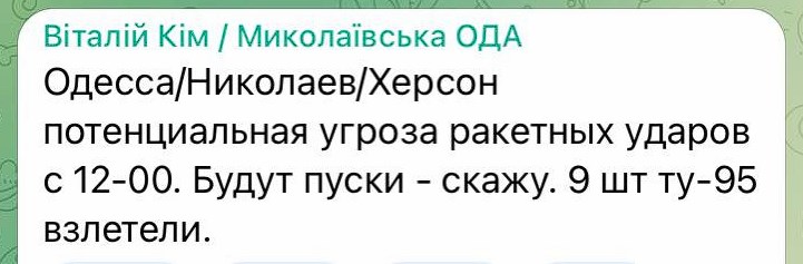 - The head of the Nikolaev OVA, Kim, reports on the potential threat of missile strikes in Odessa, Nikolaev and Kherson.