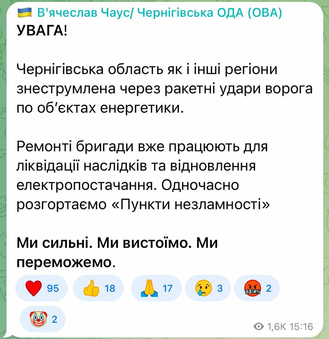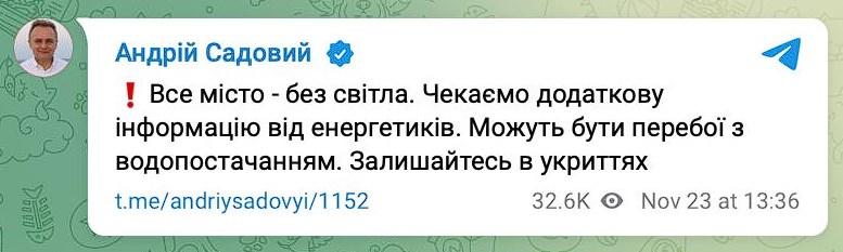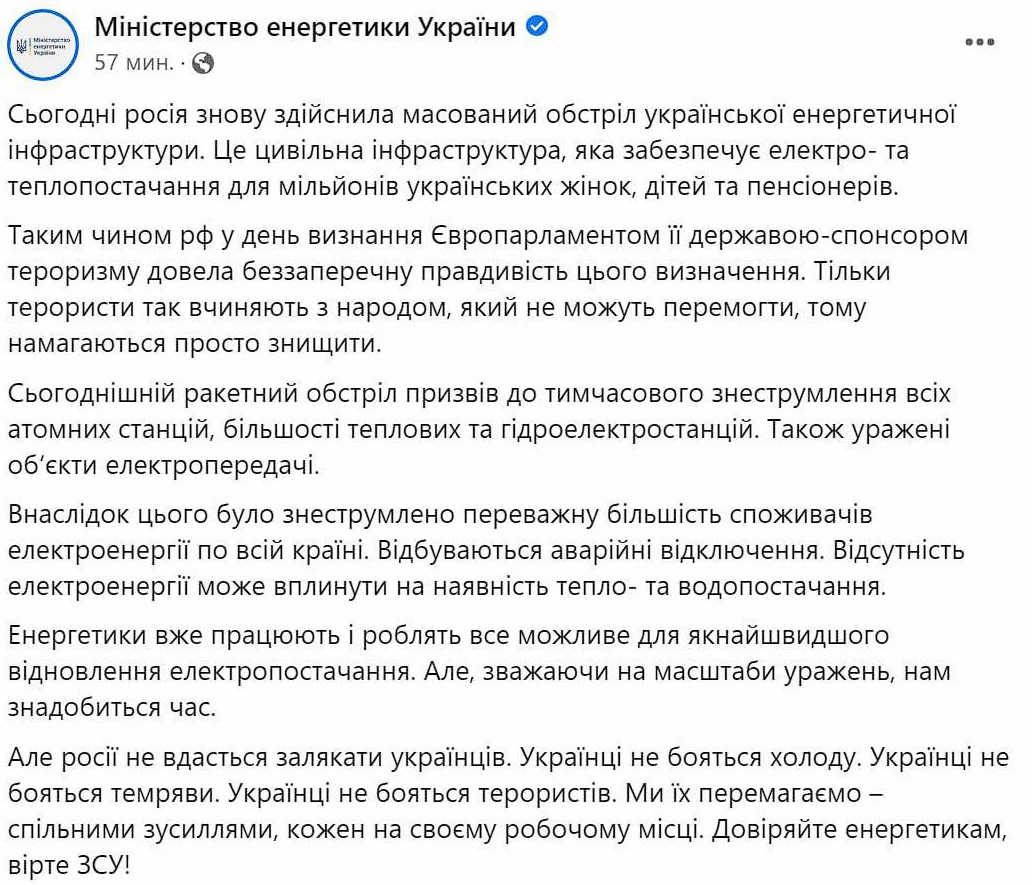 - As a result of today's missile attack on the territory of Ukraine, all nuclear power plants, thermal power plants and hydroelectric power plants were temporarily de-energized. This is reported by the Ministry of Energy. They also claim that most consumers remain without electricity.