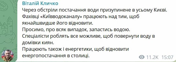 - Water supply has been stopped in all of Kyiv, — Klitschko.