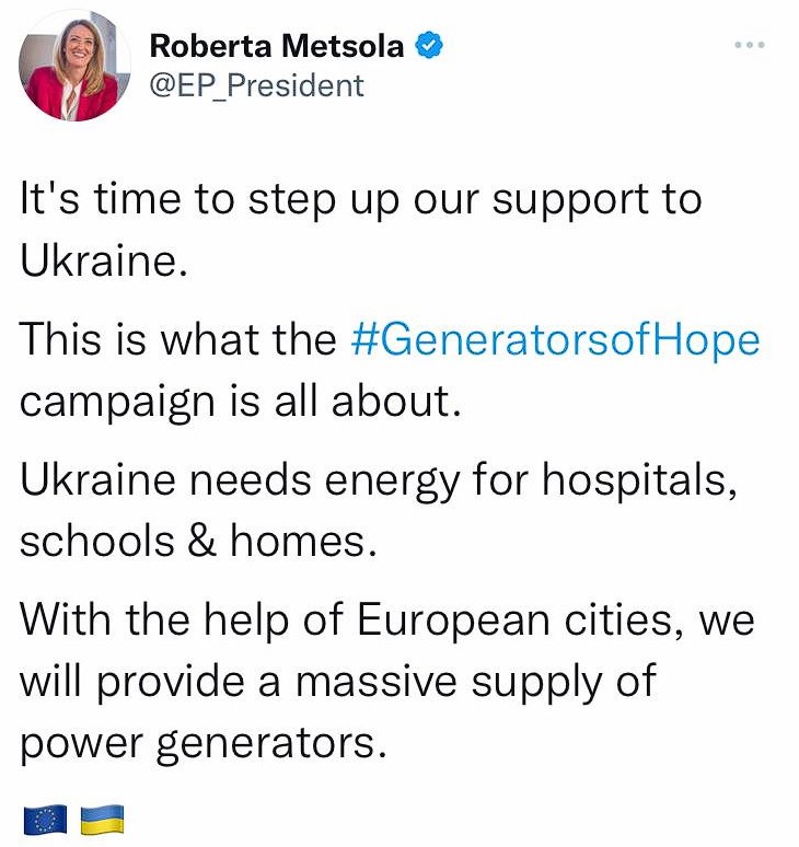 - The head of the European Parliament, Roberta Metsola, announced the launch of a campaign for the mass supply of power generators from the EU to Ukraine.