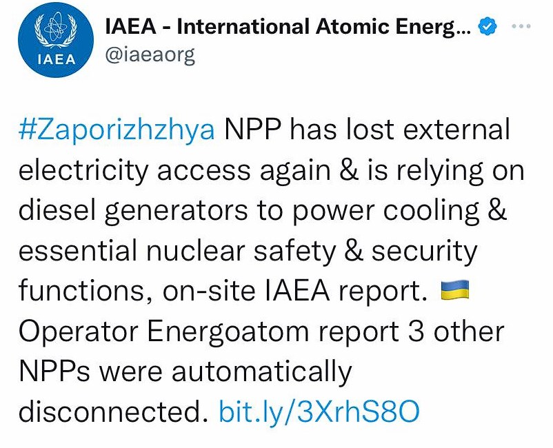 - The Zaporozhye NPP has again been disconnected from external power supply and is now operating from emergency diesel generators, the IAEA reports.