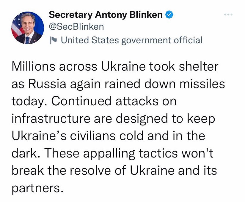 “Continued attacks on infrastructure are designed to keep Ukraine's civilian population cold and dark. This horrendous tactic will not break the resolve of Ukraine and its partners,” – written by Anthony Blinken.