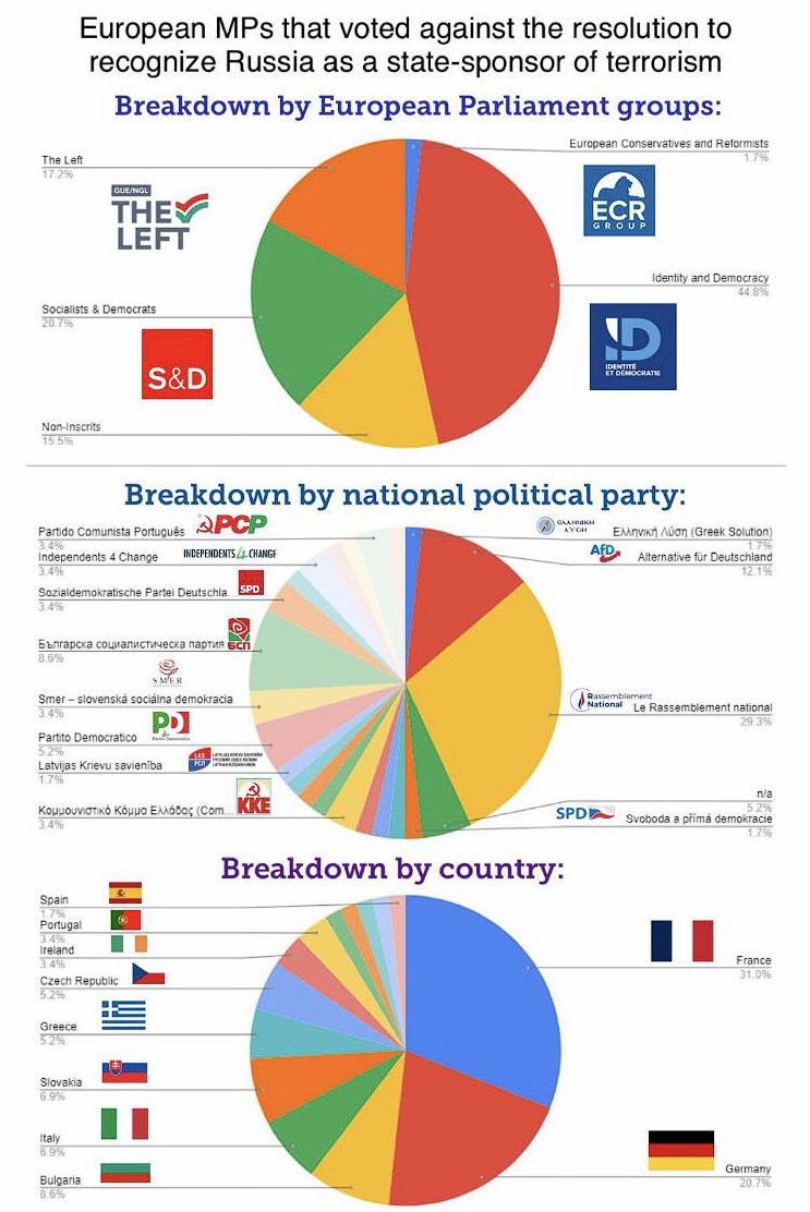- The European Parliament recognized (https://www.eurointegration.com.ua/news/2022/11/23/7151178/) Russia as a state sponsor of terrorism.