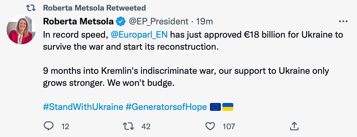 - The European Parliament approved an 18 billion euro support package for Ukraine for 2023 — head of the European Parliament.