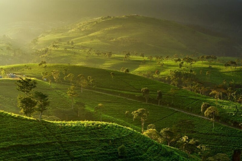 Sunrise over the Kemuning tea gardens in Central Java, Indonesia