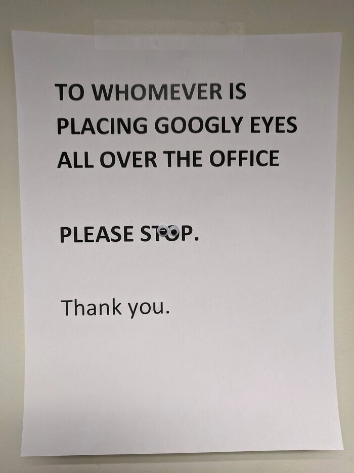 15. "For those who stick plastic eyes all over the office, please stop."