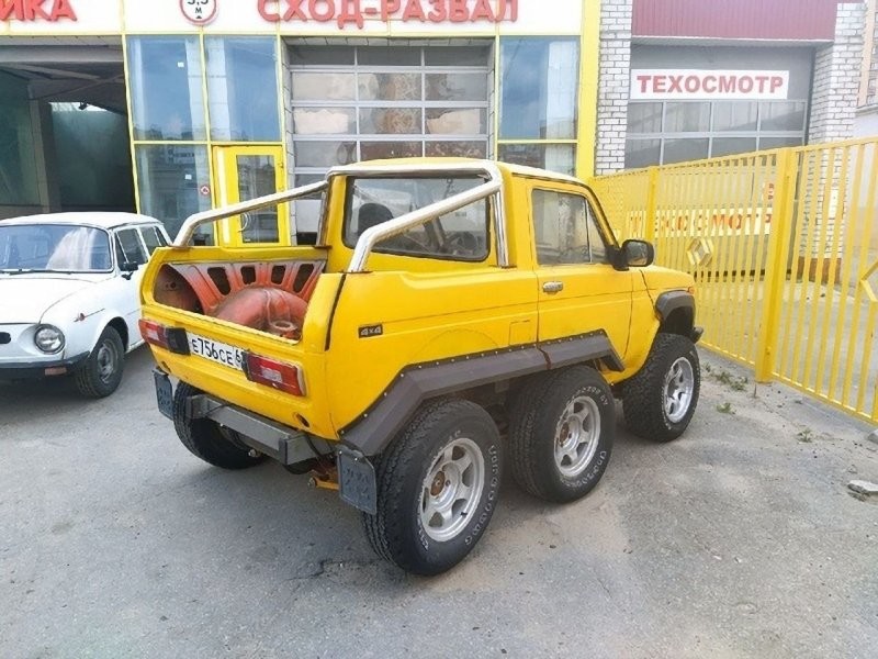 Usually, along with an “extra” pair of wheels, an SUV or pickup truck gets a longer wheelbase. But the creator of this "Niva" decided that won't do it. The result was a car, the dimensions are not exceeding the standard "Niva", the axes of which are almost evenly distributed along the entire length of the chassis.