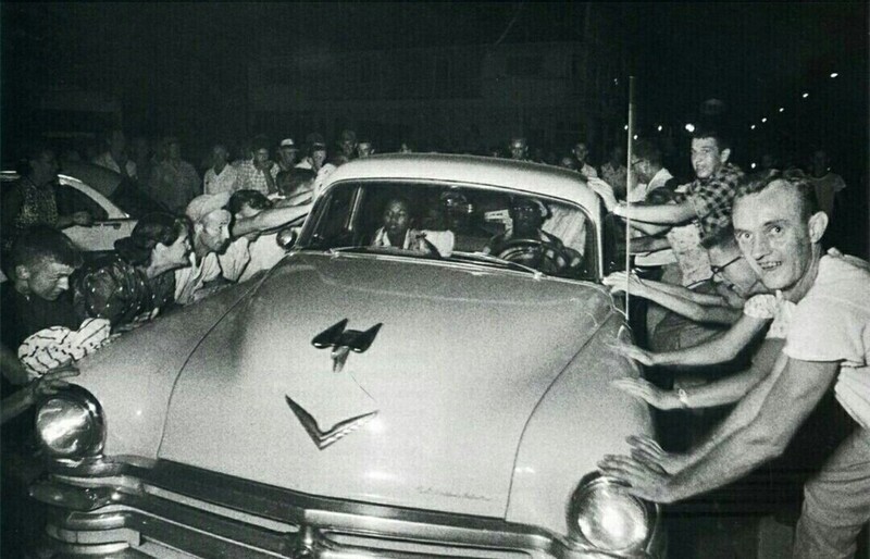 < br> 11. A crowd tries to turn over a car with a black family during a race riot in Clint, USA. 1956