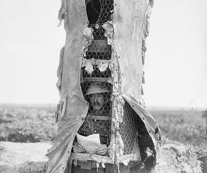 < br> 8. A British soldier hides in a fake tree trunk that is made from hide. 1918