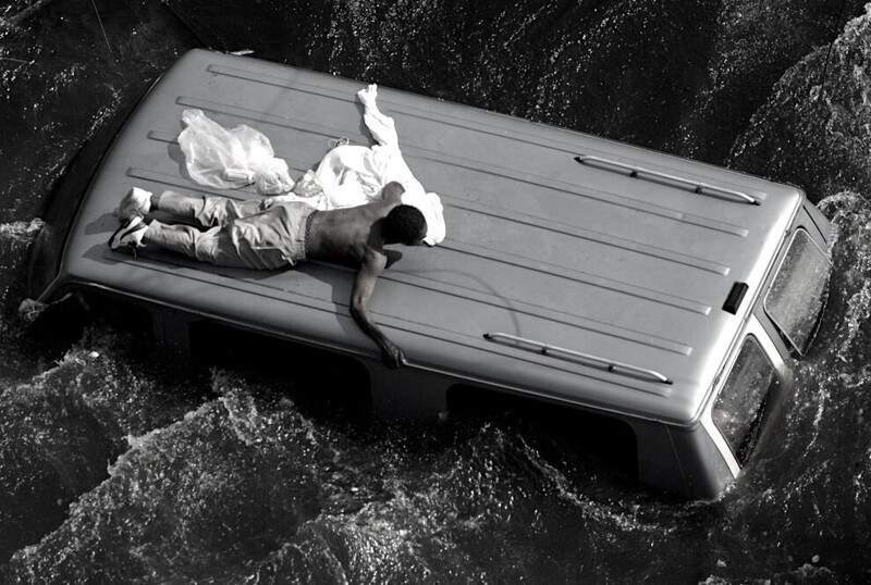 < br> 9. A man climbs onto the roof of a car in the flooded streets of New Orlen. Hurricane Katrina, September 4, 2005