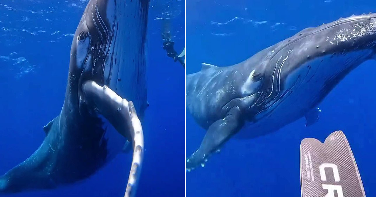 Amazing footage was filmed off the coast of French Polynesia, where a curious humpback whale approached a group of divers and for an hour swam alongside them.