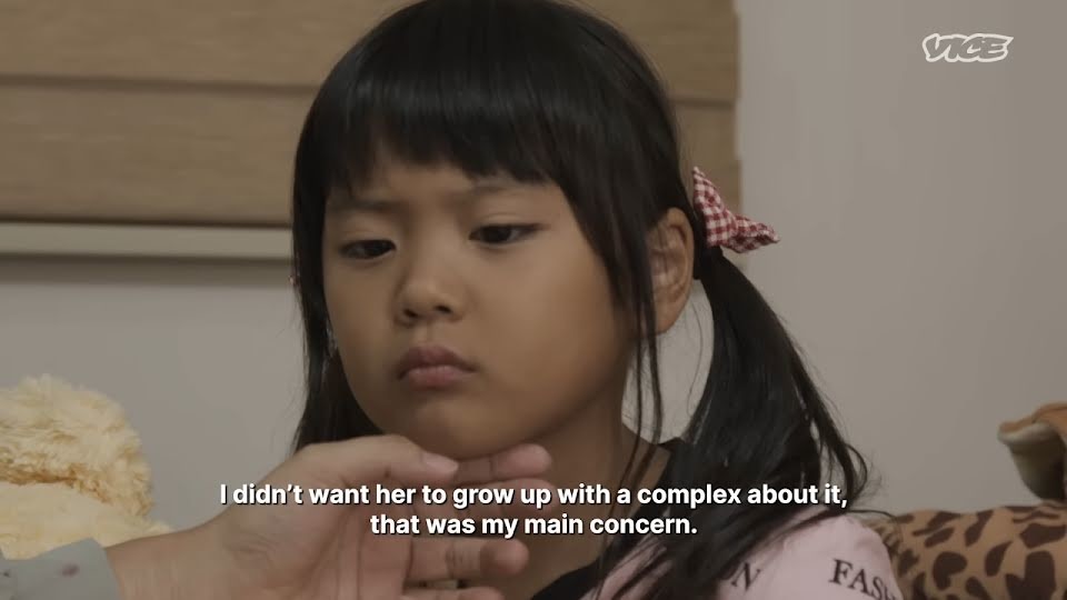 "Double eyelids are the standard of beauty. My mother and sister had big eyes, and I had one eyelid [there is no crease in the upper century], so as a child I was considered ugly. Later I made myself operation, and when my daughter was born with one eyelid, I decided persuade her too," the woman says.
