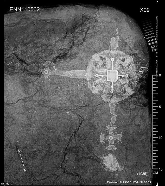 Using X-ray technology, the scientists also found in grave, two painted pots, a shallow copper dish and a large artfully decorated cross. The latter was decorated with unusual images of human faces cast in silver.