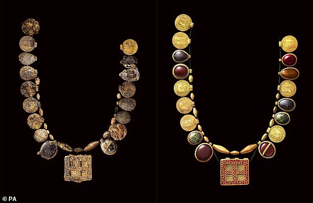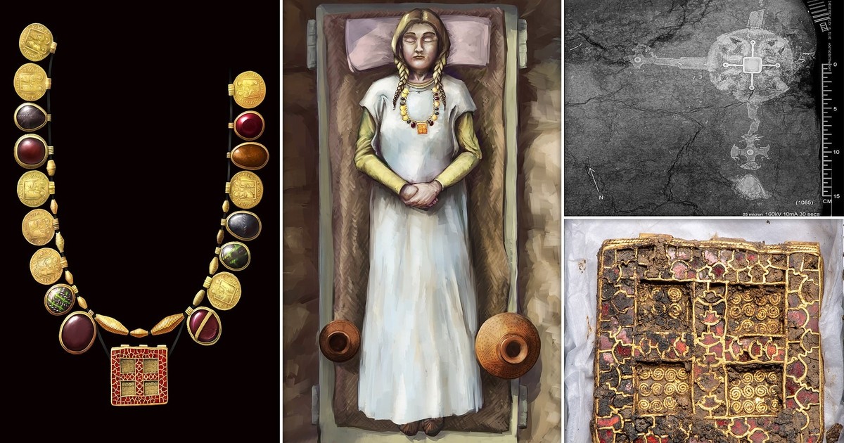 Although the grave contained other treasures, the necklace is considered the most expensive of its kind discovered in history - it is decorated Roman coins, garnet and semi-precious stones.