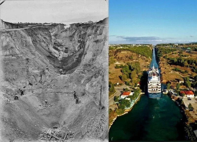 Corinth Canal in Greece 1884 and present. Before this people were paid to drag boats overland 8 kilometers coast to coast