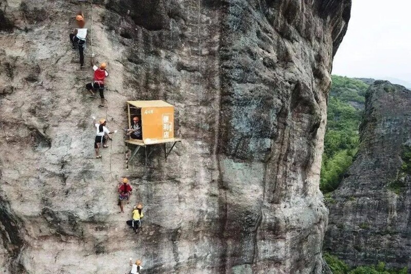 This "convenience store" in the national The Shinyuzhai Geological Park sells non-alcoholic drinks to climbers. The shop sells water, drinks and some snacks, including crisps. It is located at an altitude of 120 meters above the cliff.