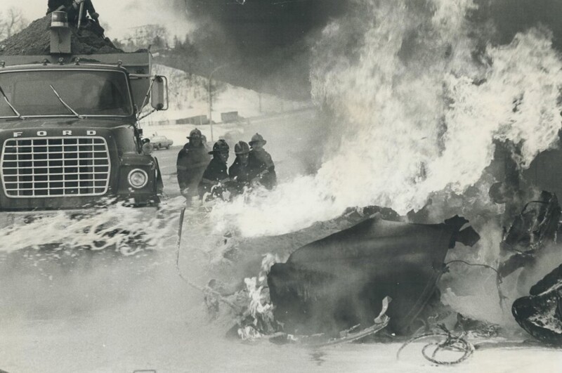 December 15, 1972. Canada. The fuel truck is on fire. Photo by Graham Bezant