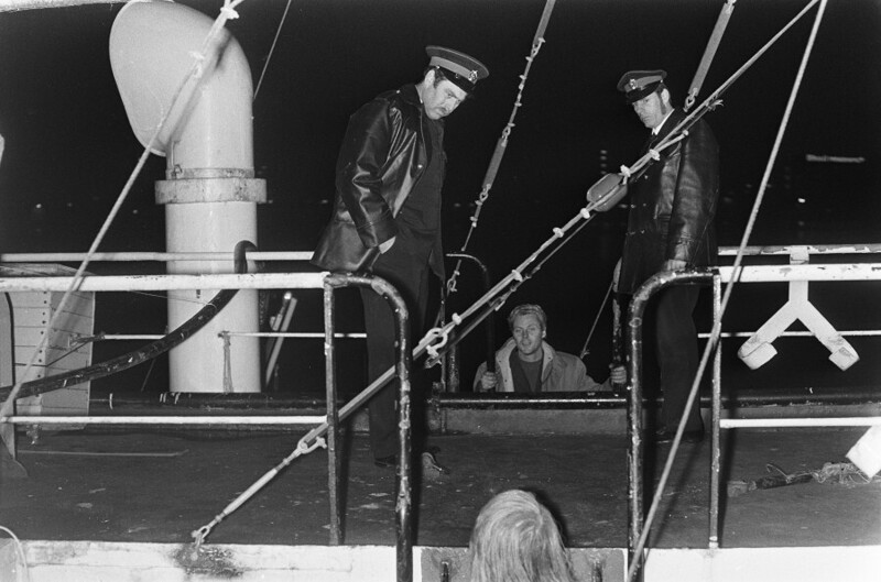 December 30, 1972. Amsterdam. Captain "Mi Amigo" Wang der Kamp, talking to a girl, possibly a journalist. On "Mi Amigo" operates a pirate radio station "Radio Caroline" - one of the most popular in Europe.