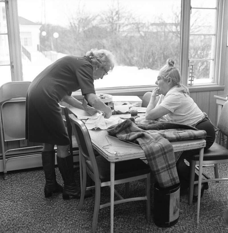 December 1972 Volunteers at the Roadhouse mend clothes.