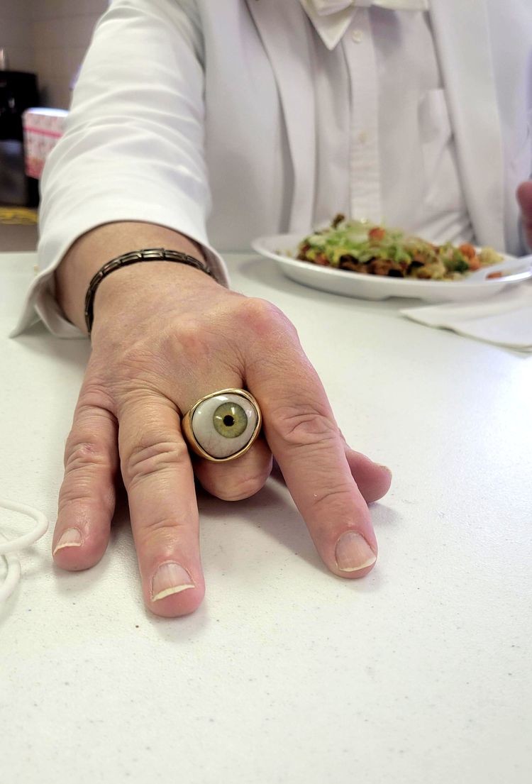 A man made a ring out of his wife's prosthetic eye. looks eerie and otherworldly-illogical. It's scary to think what he was guided by choosing such an ornament.