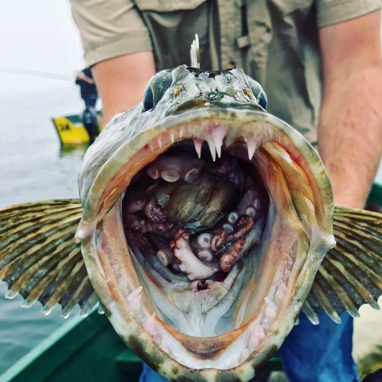 Octopus in the mouth of freshly caught fish