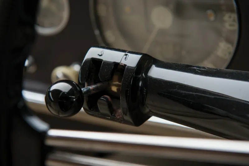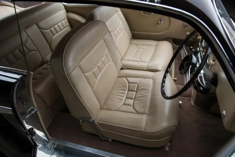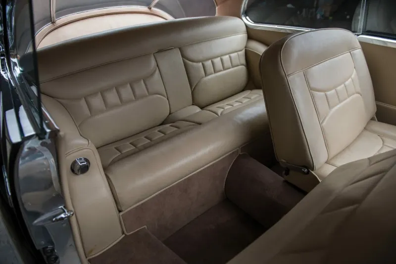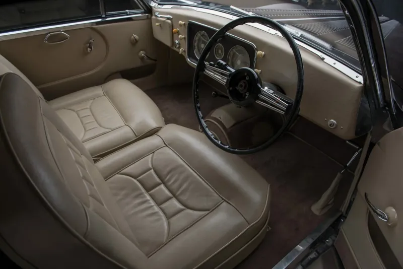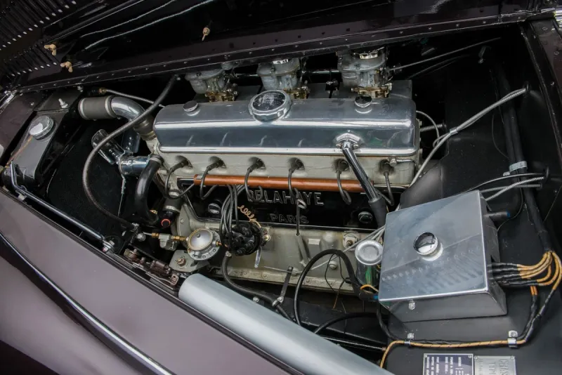 The Delahaye was brought to the US in the late 80s and has been restored by the late Mike Fennel in his current rich eggplant hue with beige interior, which is important, it very closely matches its original form. Only the original bumpers have been removed and replaced by thin chrome imitations, which made it easier and possibly improved design.