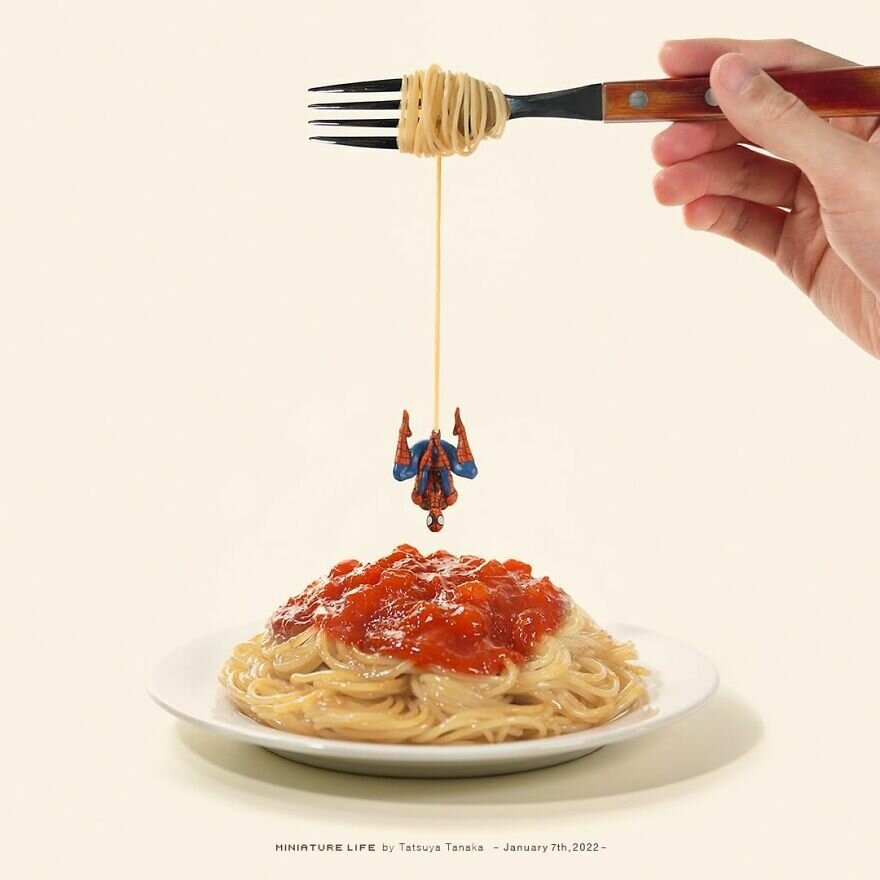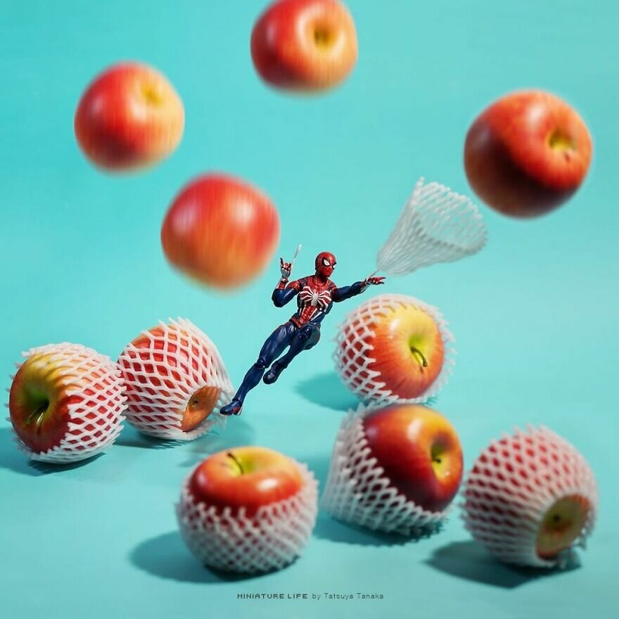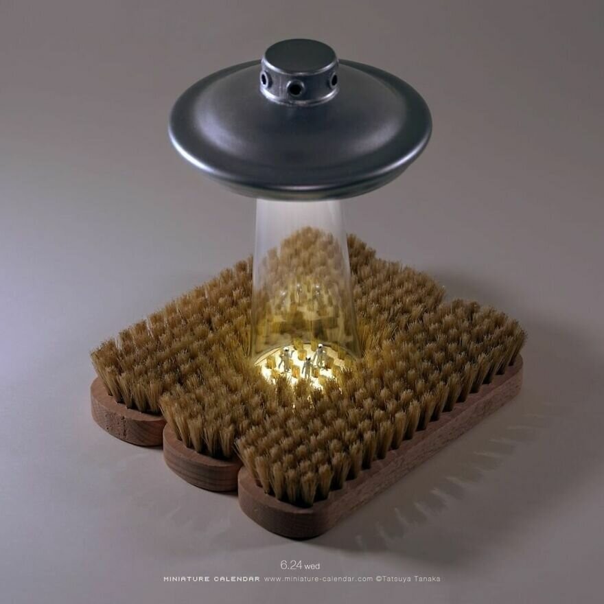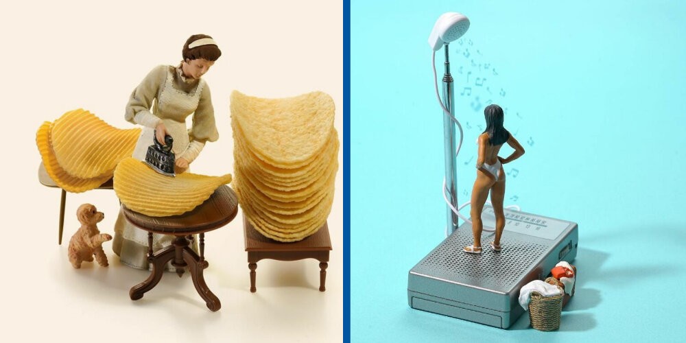 Japanese Tatsuya Tanaka fantasizes about this topic every day. Without exaggeration. Since 2011, the artist has been creating 7 days a week dioramas showing tiny people living in a world of huge things.