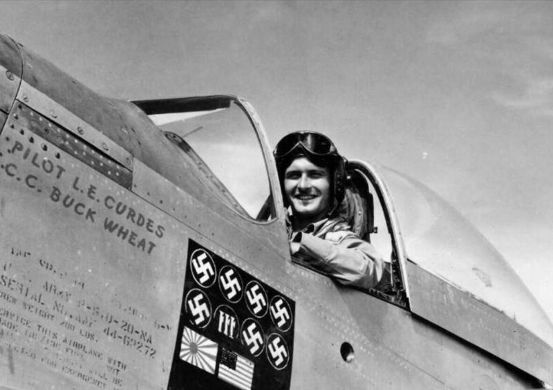 American WWII pilot Louis Cairds knocked out ten planes, as evidenced by the ones on board his Mustang R-51 signs