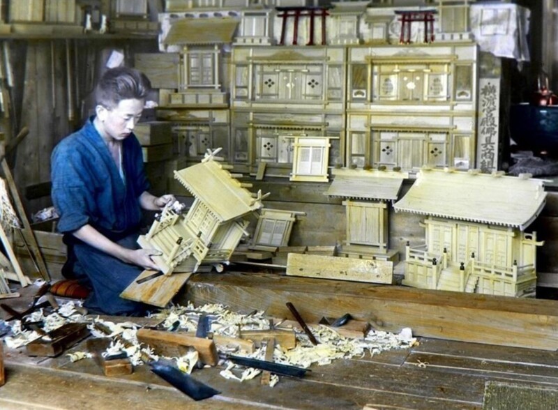 Master in the manufacture of miniature models of houses at work. Japan. 1889