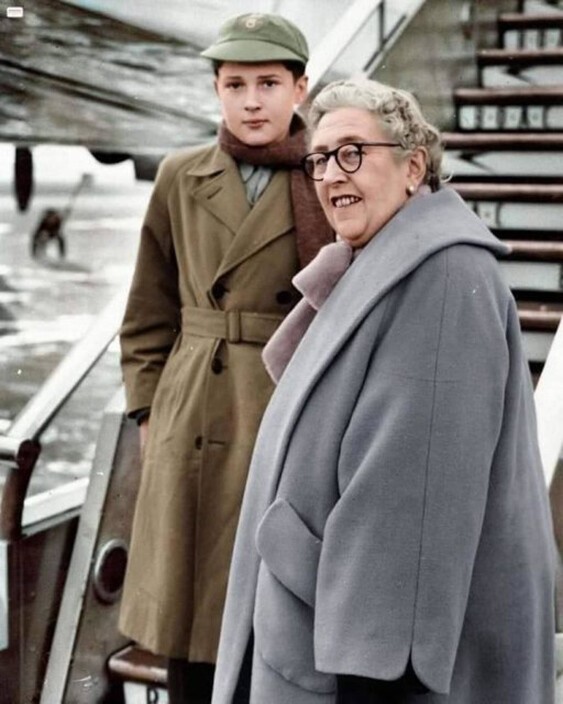Agatha Christie and her grandson Matthew. London, UK, 1955