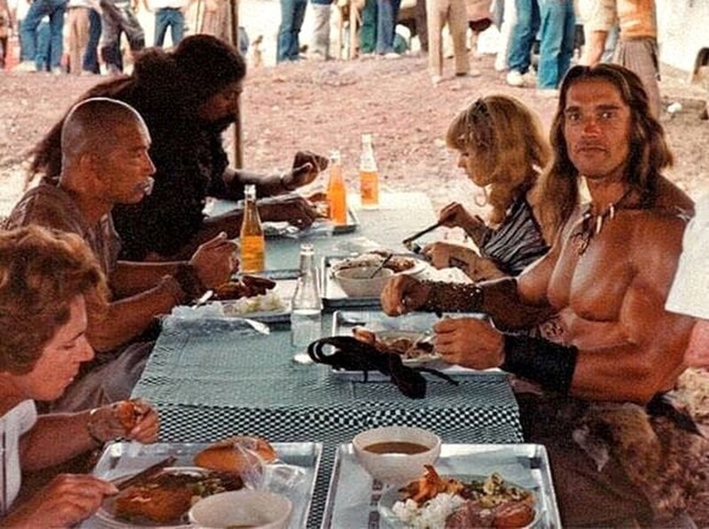 Arnie and the crew members having lunch on the set of Conan the Destroyer. 1984