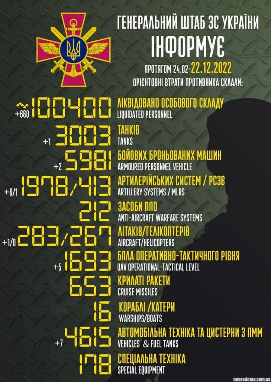 The General Staff of the Armed Forces of Ukraine stated that the losses of Russian troops since the beginning of the war have reached 100,000 people.