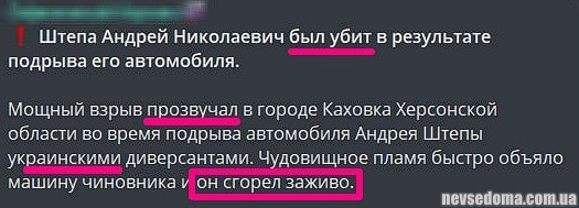 In the Kherson region, a car was blown up along with a "Gauleiter" occupiedNoah Lyubimovka, Kakhovsky District, Andrey Shtepa. According to Russian resources, Shtepa was blown up in the captured Kakhovka by "Ukrainian saboteurs."