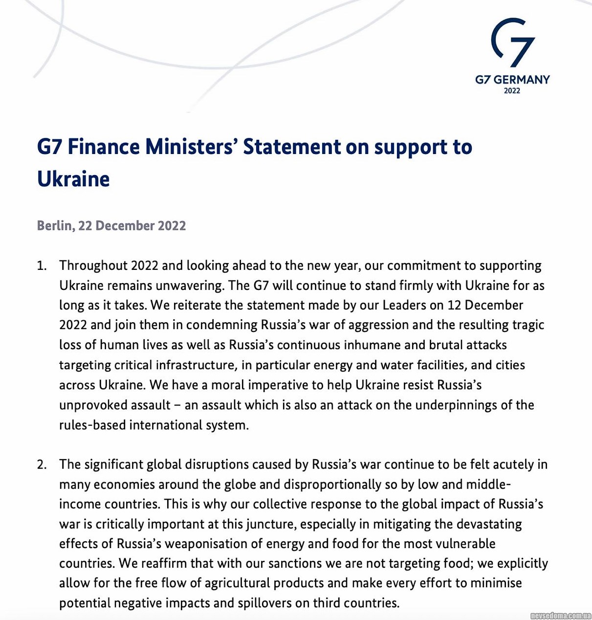 - The G7 announced that it had collected $32 billion for budget assistance to Ukraine in 2023.